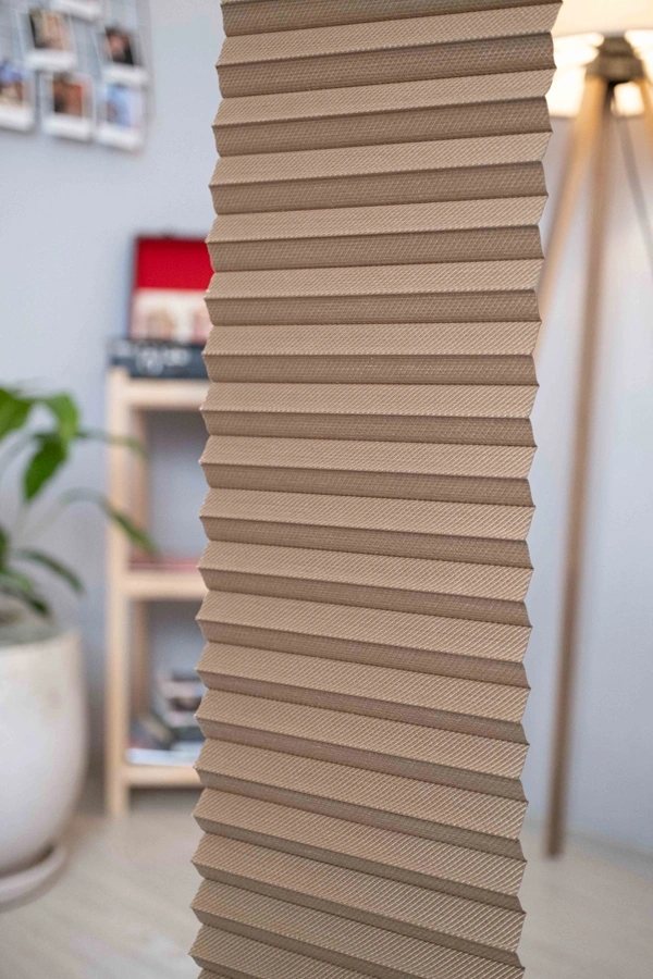 Dimout Serisi - Uranüs Modeli Kahverengi Yarı Karartma Plise Perde, %70 oranında ışık kesme özelliği sayesinde gündüz içeriyi loş bir karanlığa çevirirken, akşamları yoğun ışık olsa bile içerinin görünmesini tamamen engeller. Mahremiyet odaklı, şık ve fonksiyonel bir modeldir.